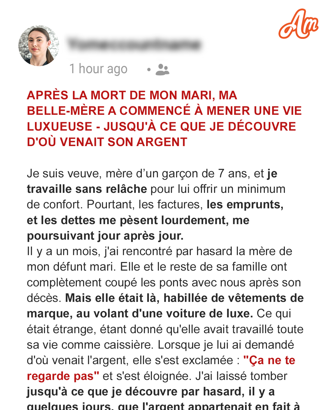 La mort de mon mari nous a brisés, mon fils et moi. Mais la perte de la famille que je croyais être la nôtre a été une blessure d’un autre genre. Sa mère a rompu les liens avec nous. Des mois plus tard, je l’ai vue drapée d’une richesse qu’elle n’avait jamais eue auparavant. J’ai senti que quelque chose clochait. D’où venait cet argent ? La vérité m’a ébranlée.