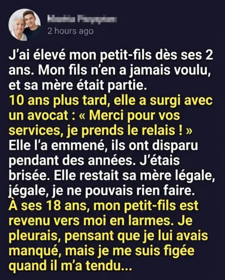 Il existe des liens que rien ne peut vraiment briser, même pas le temps, la distance ou les décisions des adultes. Certaines histoires rappellent que l’amour transmis au quotidien laisse une trace indélébile. La mienne est particulièrement bouleversante, car j’ai élevé mon petit-fils comme mon propre enfant… avant qu’on ne me l’enlève. Pendant des années, j’ai vécu dans le silence et l’absence, jusqu’au jour où quelqu’un a frappé à ma porte.