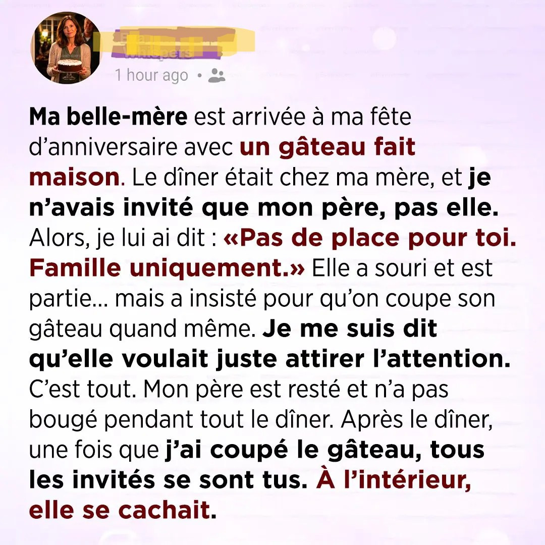Mon dîner d’anniversaire devait être simple, presque banal. Un repas fait maison, quelques proches, une ambiance tranquille chez ma mère. Rien de spectaculaire, rien de trop chargé émotionnellement. J’avais invité mon père, parce qu’il avait toujours fait de son mieux pour rester présent. Mais il y avait une personne que je n’avais volontairement pas conviée : ma belle-mère.
