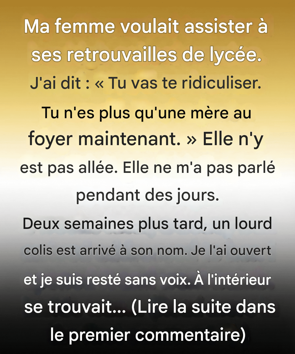 Elle se tenait dans l’embrasure de la porte de la cuisine, la lumière captant le bord de l’invitation dans ses mains. Il y avait une douceur pleine d’espoir dans son sourire — un sourire que je n’ai vraiment vu qu’après qu’il ait disparu. Sans réfléchir, sans cruauté mais plein d’arrogance, j’ai parlé.