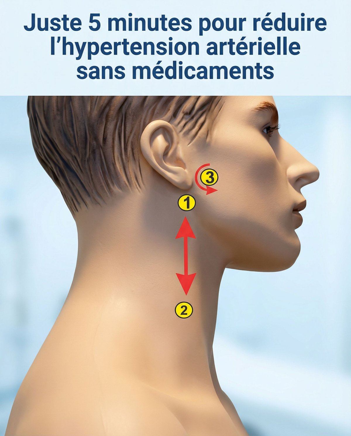 Il n’est pas nécessaire de masser ni de presser cette ligne qui passe du milieu de la clavicule jusqu’à l’arrière du lobe de l’oreille. Avec le bout des doigts, caressez doucement cette ligne du bas vers le haut. Faites cela 10 fois d’un côté et 10 fois de l’autre côté