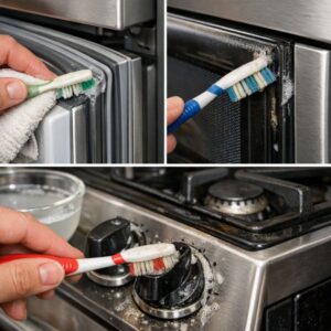 Les appareils de cuisine ont souvent de petits recoins où les particules alimentaires et la graisse peuvent s’accumuler. Une vieille brosse à dents est parfaite pour nettoyer ces zones. Utilisez une solution d’eau tiède et de vinaigre ou un nettoyant de cuisine doux. Frottez les joints de votre réfrigérateur, les bords de la porte du micro-ondes, ainsi que autour des poignées et poignées de votre cuisinière. Les poils peuvent atteindre les espaces étroits sans rayer les surfaces, donnant ainsi à vos appareils un aspect et une odeur propres.