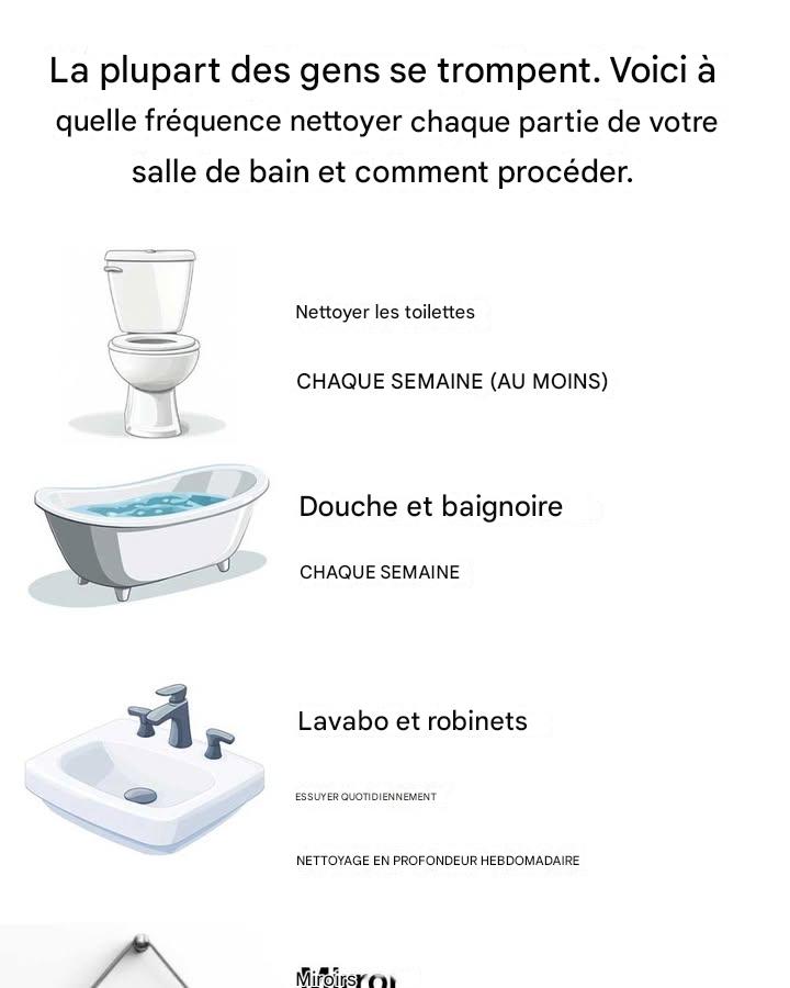 ultime de nettoyage de salle de bain Créer un planning de nettoyage garantit que chaque partie de votre salle de bain reçoive l’attention dont elle a besoin. Si certaines tâches doivent être effectuées quotidiennement, d’autres peuvent être programmées chaque semaine ou chaque mois. Par exemple, essuyer les surfaces et désinfecter les zones très touchées devrait être une tâche quotidienne, tandis que le nettoyage en profondeur de la douche et le frottage du coulis peuvent être réservés à une routine hebdomadaire. Une liste mensuelle pourrait inclure des tâches comme nettoyer les bouches d’aération et laver les rideaux de douche. Adapter ce planning aux besoins de votre foyer aidera à maintenir une salle de bain toujours propre.