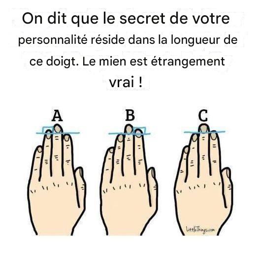 Pour voir ce que vos doigts disent de vous, redressez votre main gauche et comparez-la aux images ci-dessous. La main « A » signifie que votre annulaire est plus long que votre index. La main « B » signifie que votre index est plus long que votre annulaire. La main « C » signifie que ton annulaire et ton index ont la même longueur.La main « A » signifie que tu es charmant !
